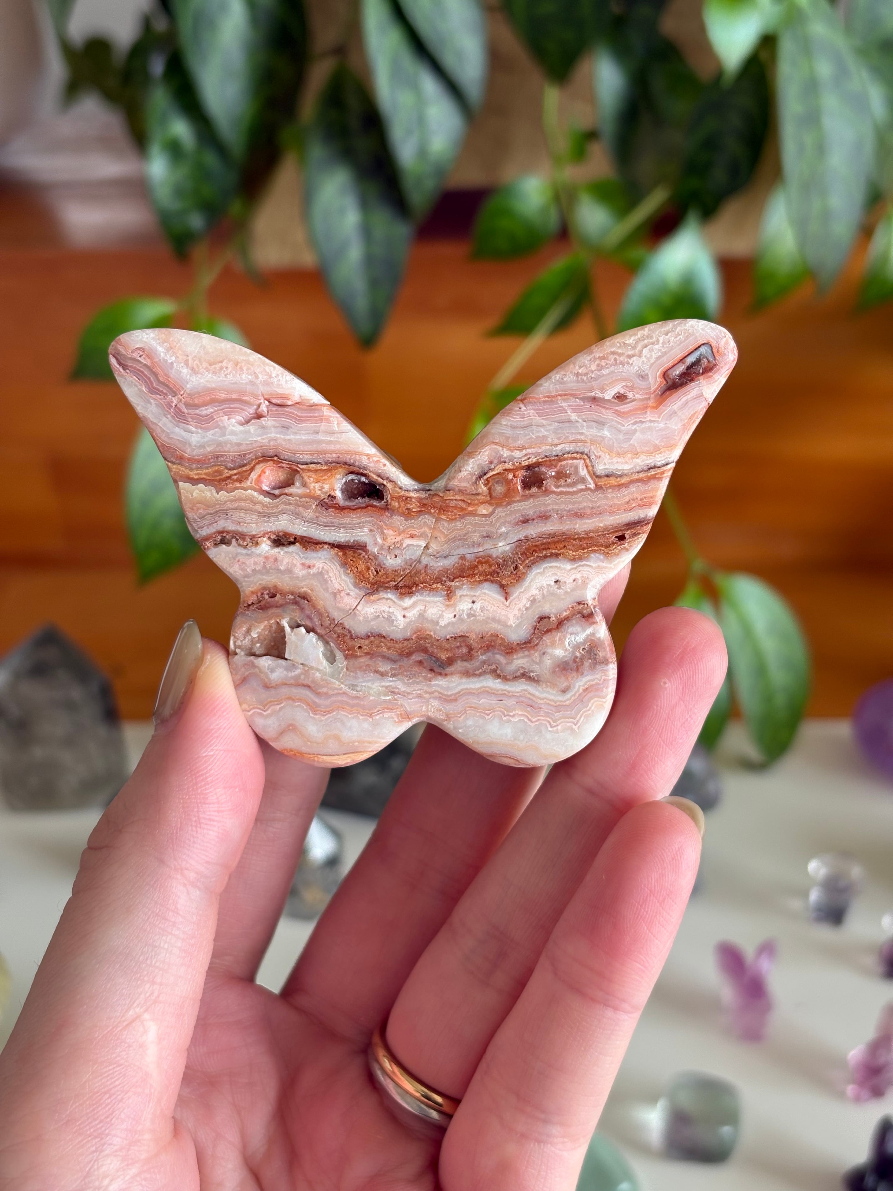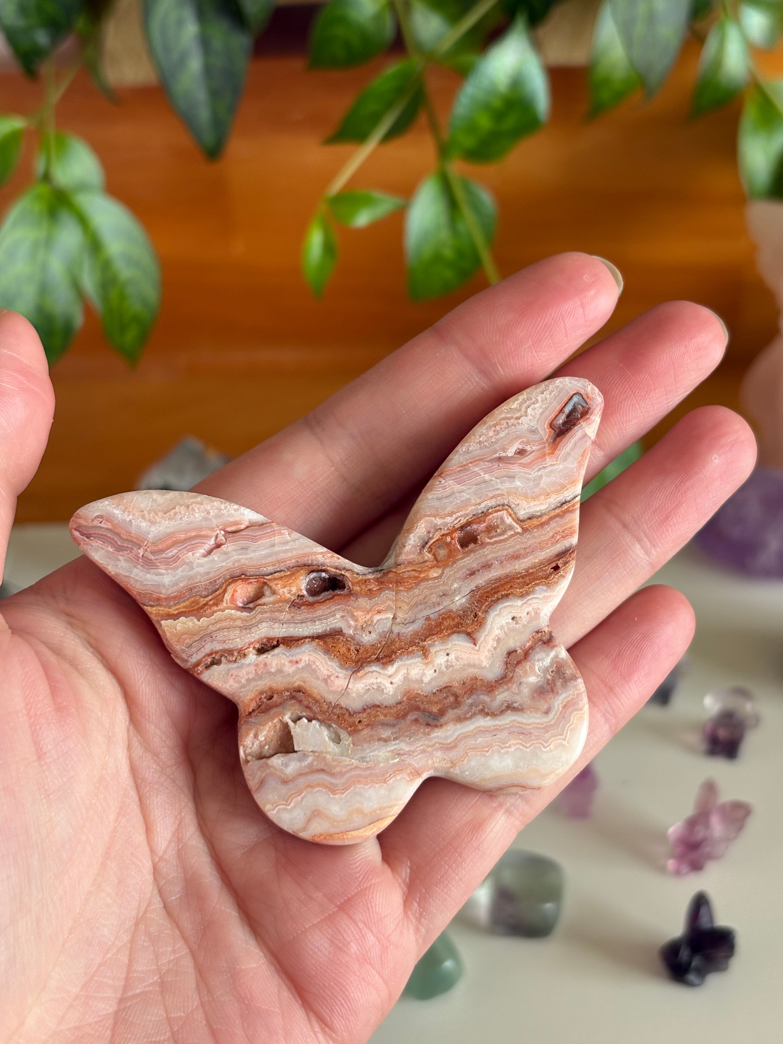 複雑に重なり合う模様と、優しいピンクの色合いが印象的なピンククレイジーレースアゲート。